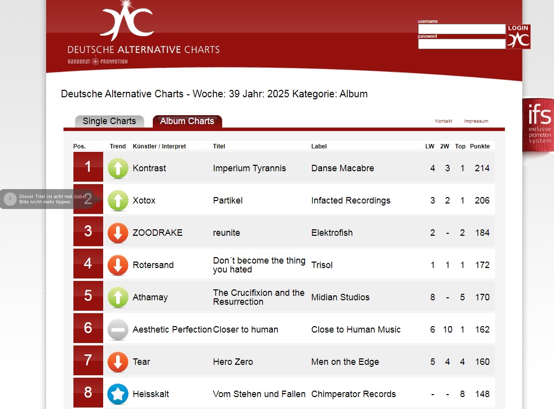 Unser sechstes Album „Imperium Tyrannis“, der erste Teil unseres Doppel-Werkes „Imperium“, ist veröffentlicht! Seit Freitag, 13.06.2025, sind die Songs bei Spotify, iTunes und Co. verfügbar, seit 04.07. ist auch die lang ersehnte Vinyl-Schallplatte verfügbar. Wir freuen uns sehr, dass „Imperium Tyrannis“ am 18.08. auf Platz 2 der Deutschen Alternative Charts eingestiegen ist und in der Woche vom 29.09. bis 05.10. sogar den Spitzenplatz 1 erreicht hat!